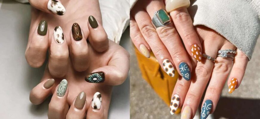 Маникюр в стиле бохо не любит излишней «искусственности». Лучше всего смотрятся мягкий квадрат, миндаль или овальная форма ногтей. Длина — умеренная, комфортная в повседневной жизни. Ведь бохо — это про свободу, а не про ограничения. Даже на коротких ногтях такой дизайн будет смотреться стильно и уместно.