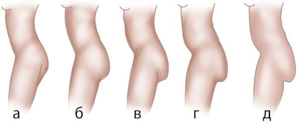 Патология проявляется потерей четких контуров у ягодичной зоны из-за опущения центральной ягодичной зоны вниз, в результате складка между ягодицами и бедрами становится выраженной.